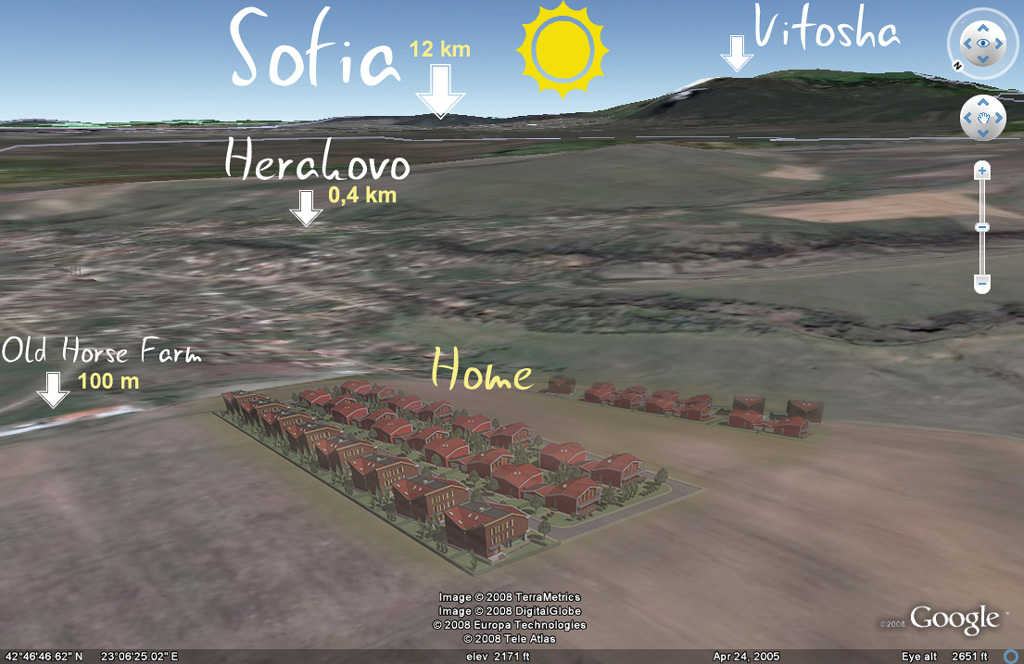 The complex is situated above the village of Herakovo on a plateau overlooking the surrounding fields and all houses have attractive view to the Sofia plain and the surrounding mountains. The sunny days and the clear panoramic view together with "green" principles of construction and inhabitancy is our understanding of a future complex.